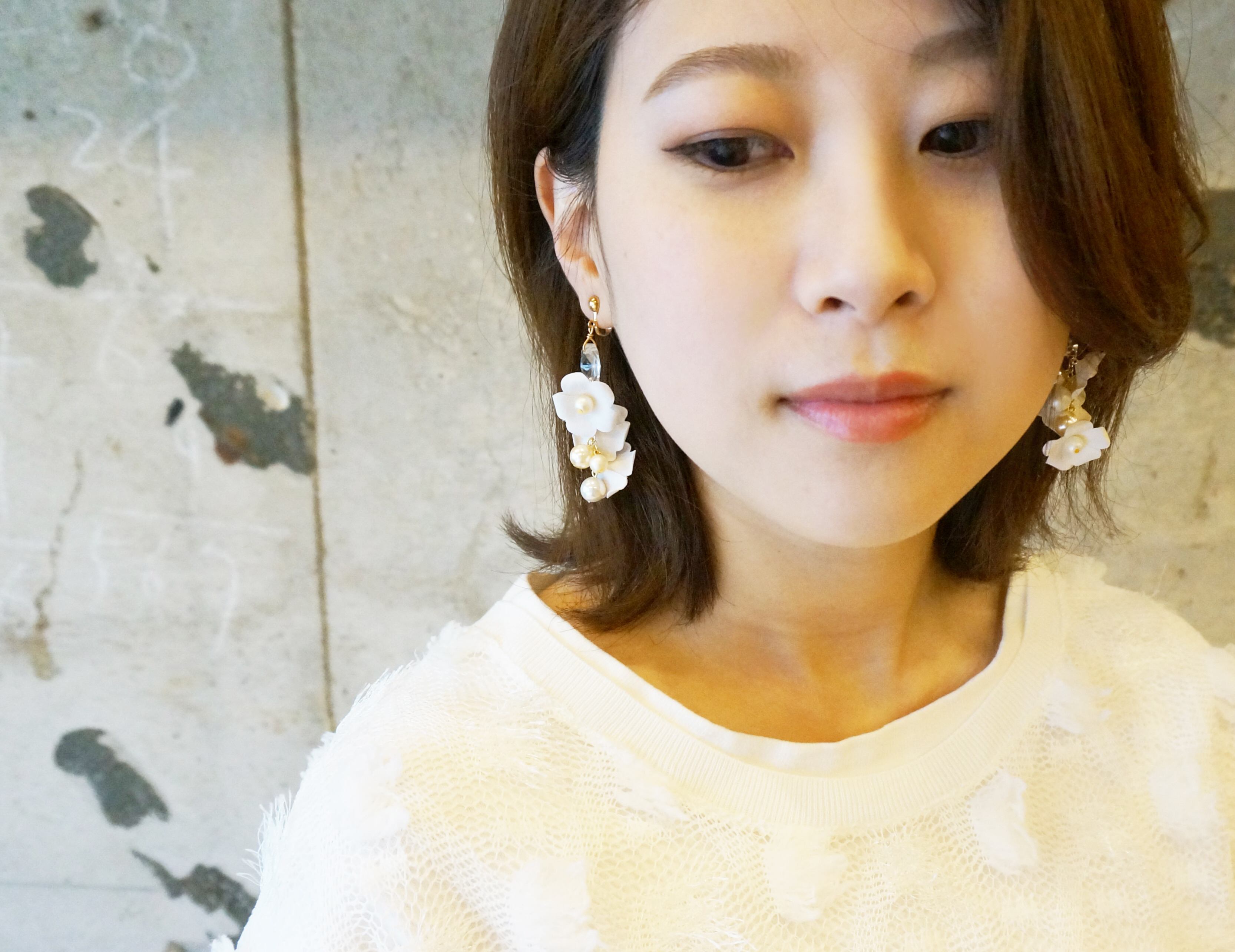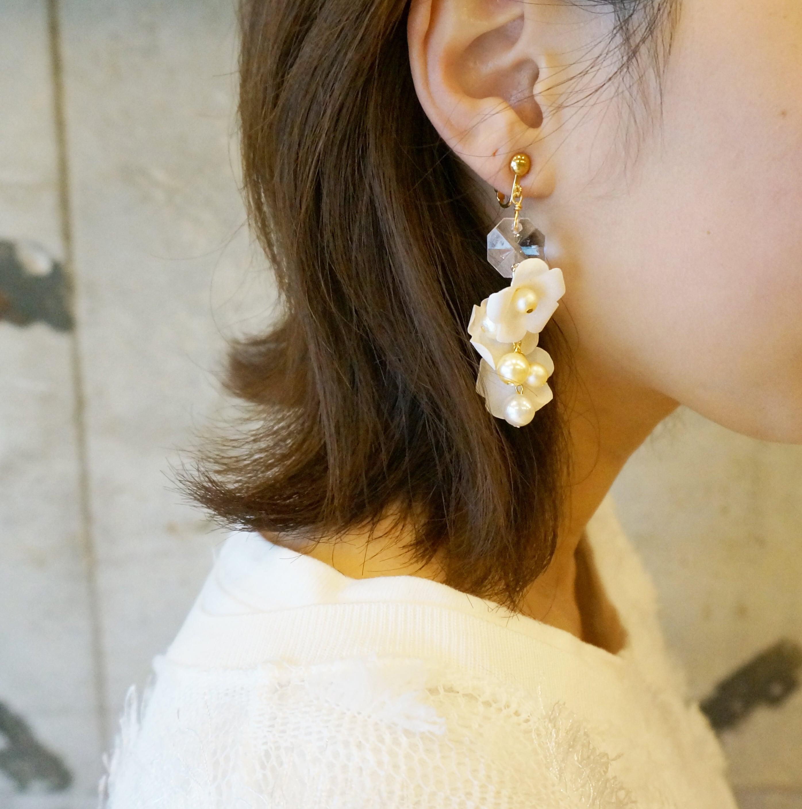 アクリルのシャンデリアモチーフがアクセントのフラワーイヤリングです。