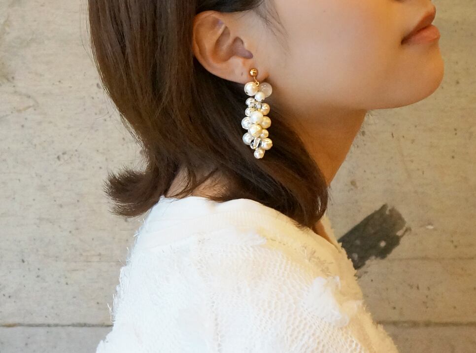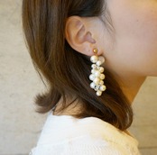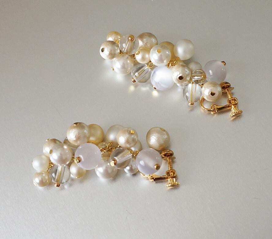 いろいろなテクスチャのパールビーズを組み合わせた透明感あふれるイヤリングです。