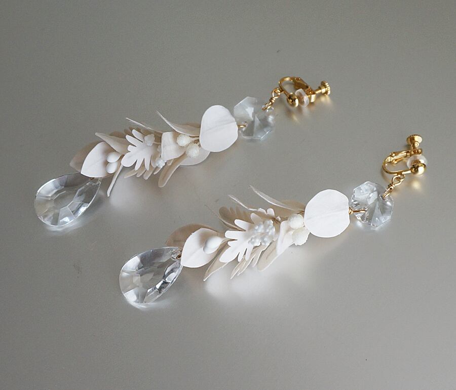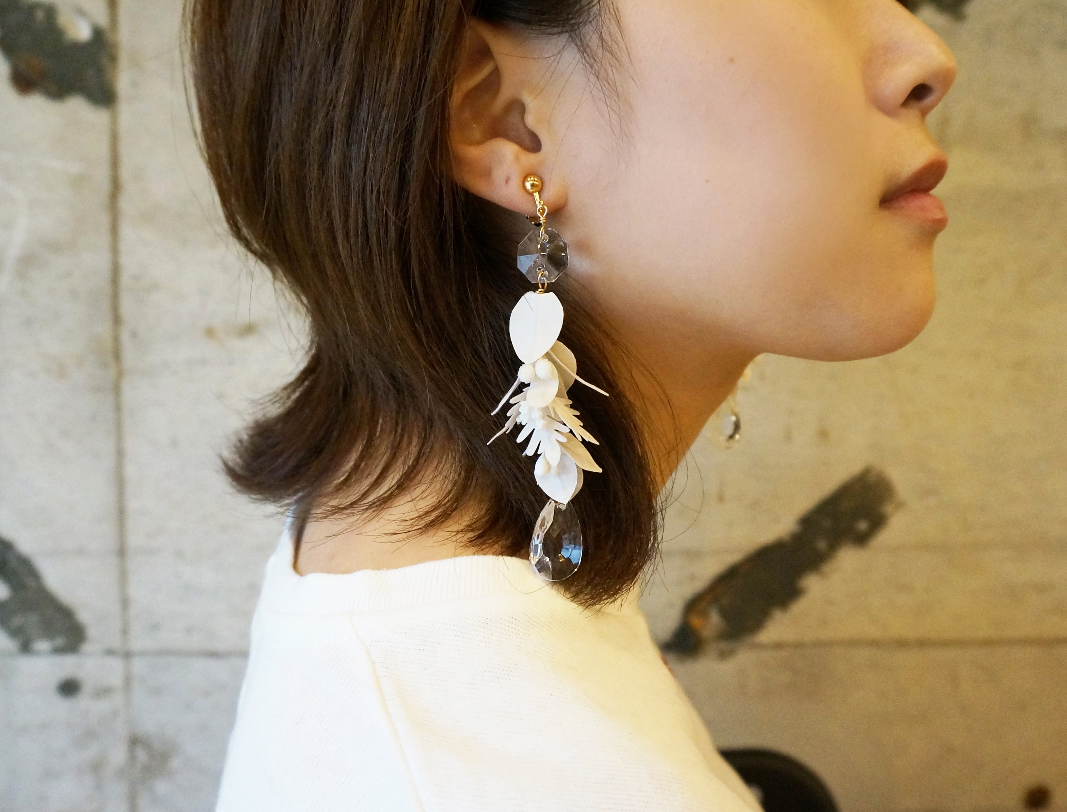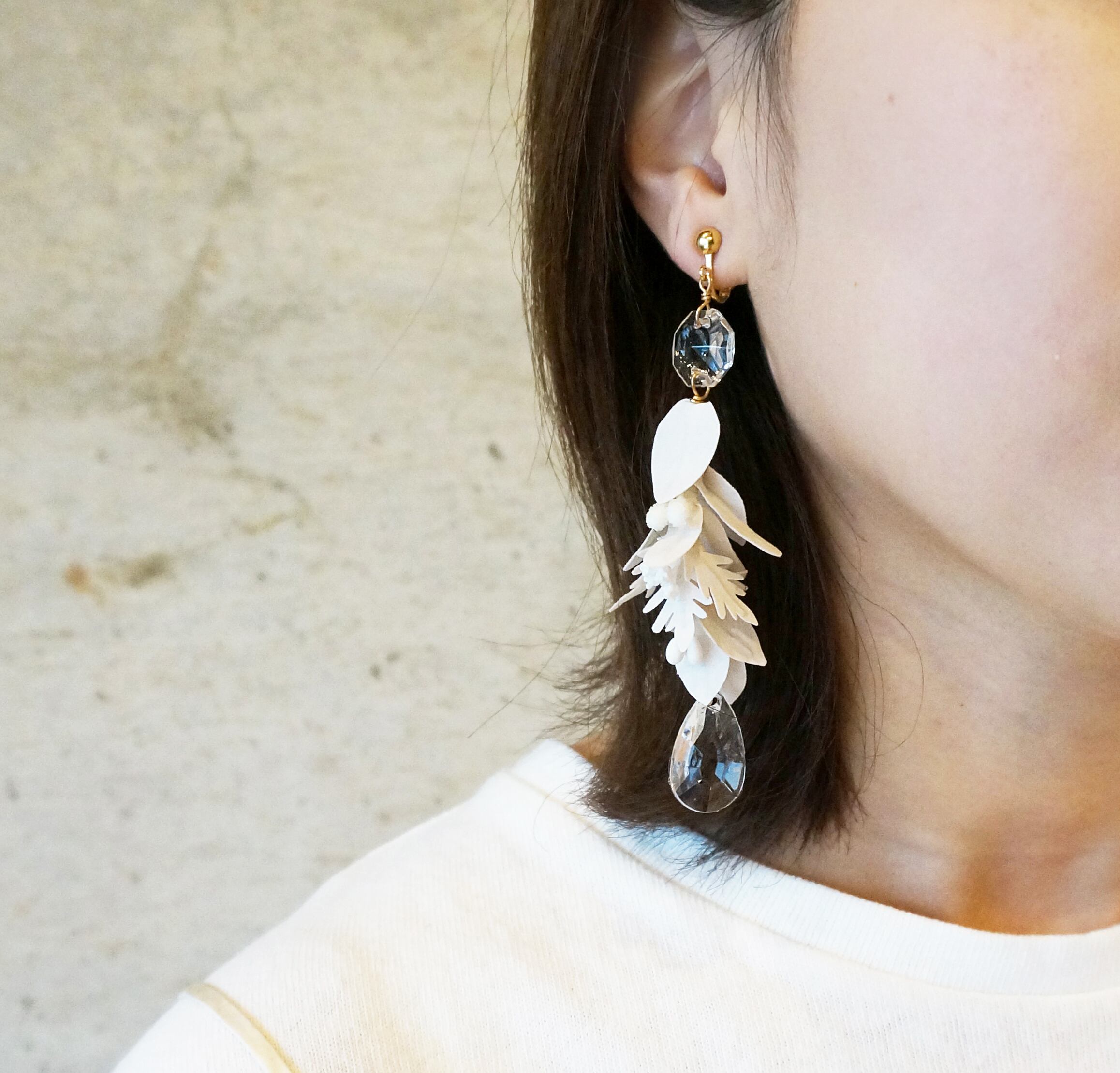 マットなテキスタイルと透明感のあるアクリルパーツを組合わせたイヤリング。