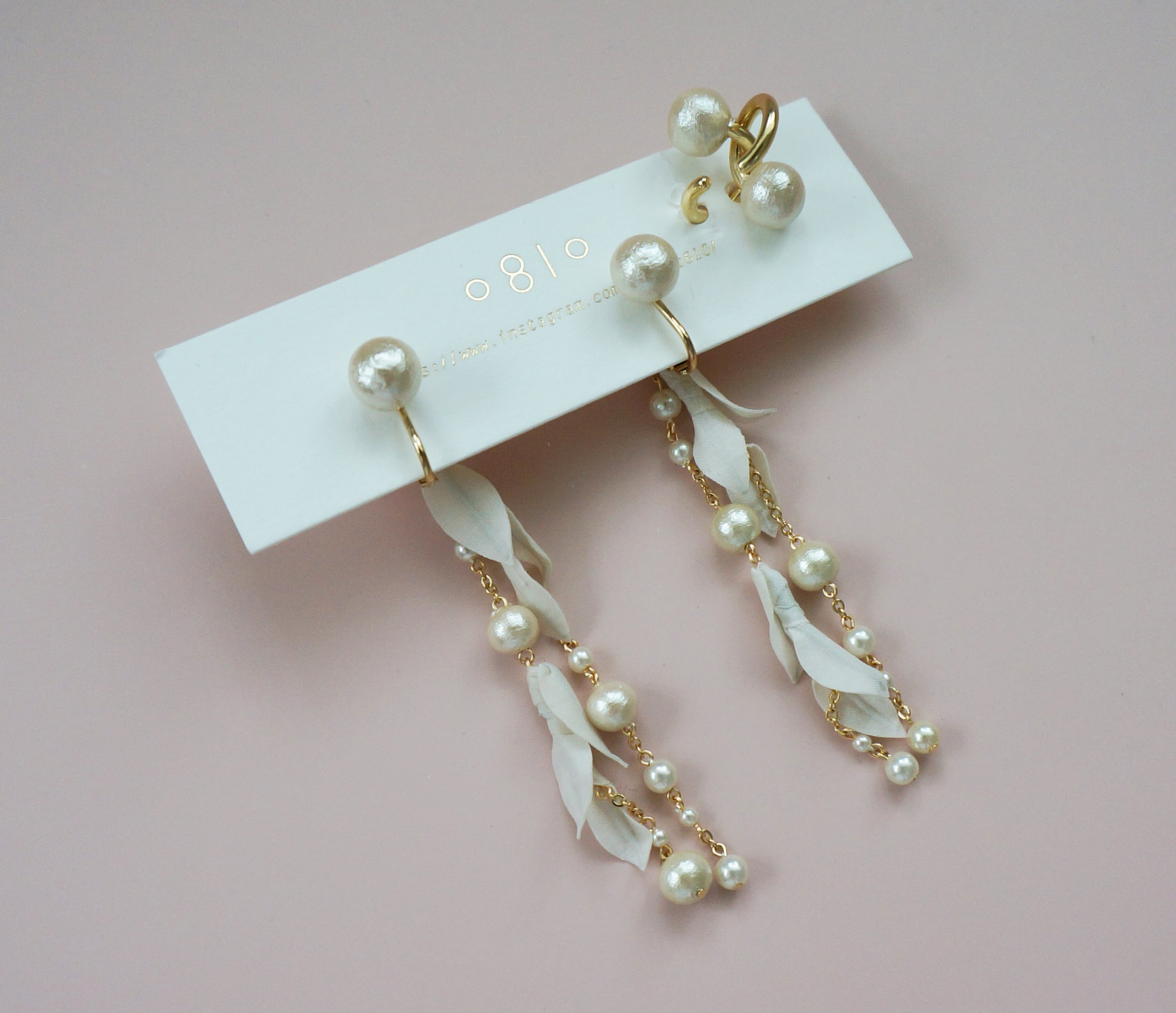 コットンパールを使ったイヤーカフとロングイヤリングのセット
