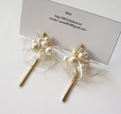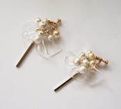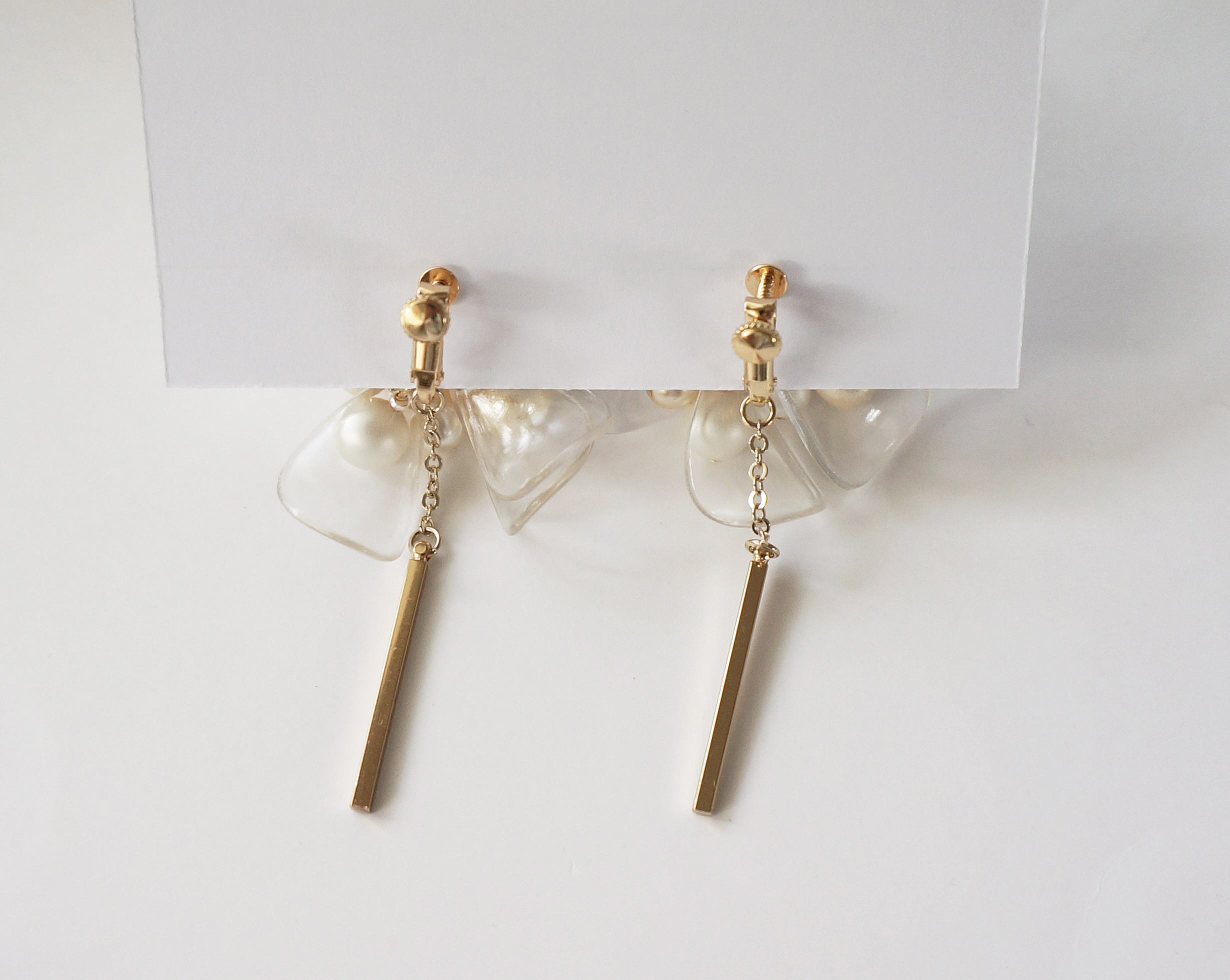 クリアカラーのアクリルパーツと、いろんなホワイトカラーのパールビーズを組み合わせたイヤリングです。
