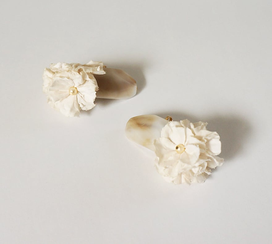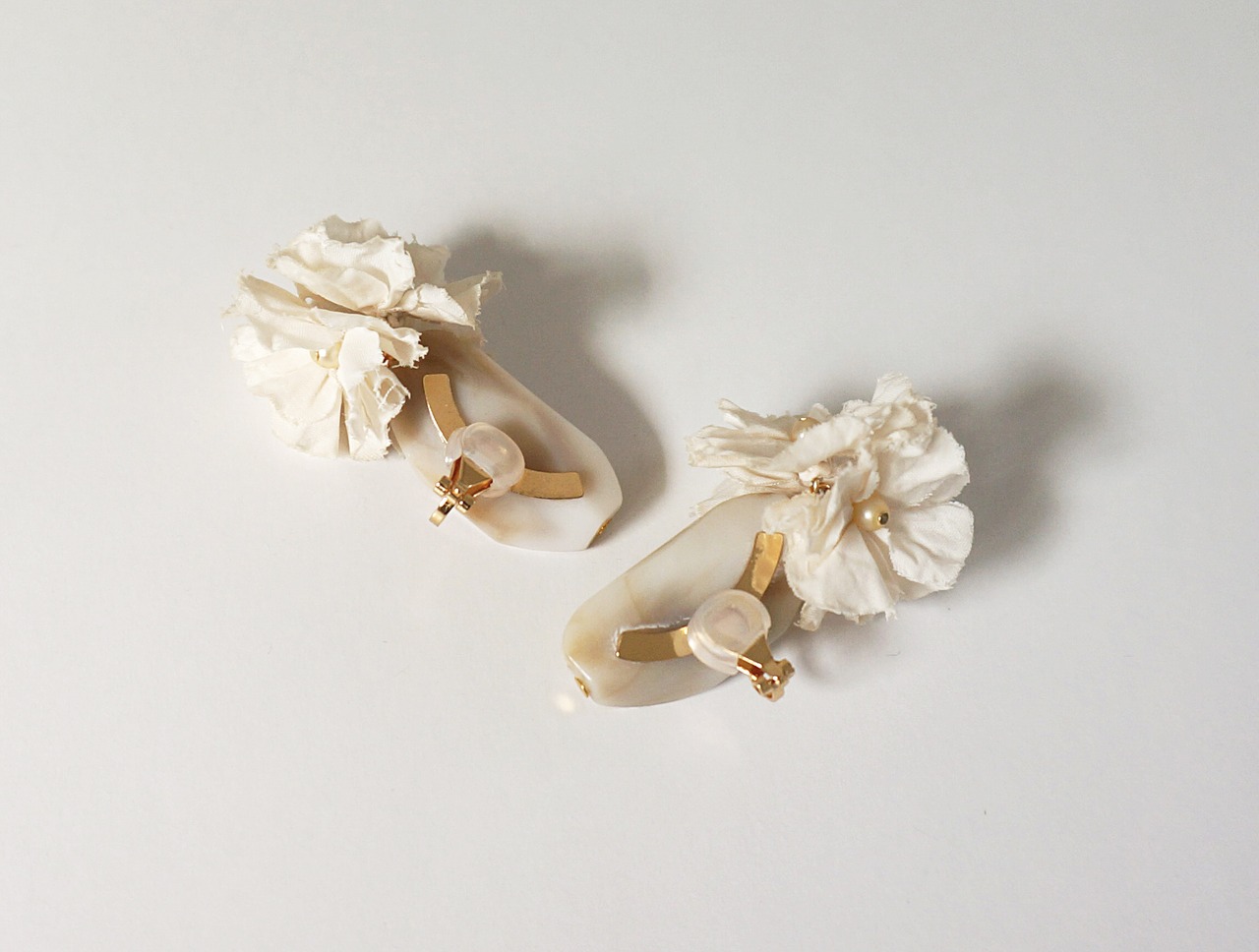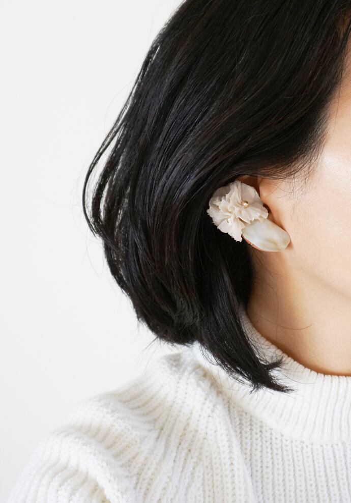 アクリルビジューにコットンフラワーを組み合わせたイヤーカフ。