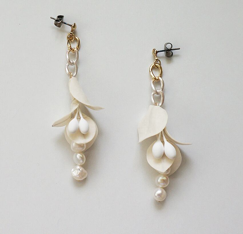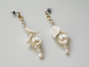 ナチュラルな葉っぱモチーフ、淡水パールを連ねたピアス