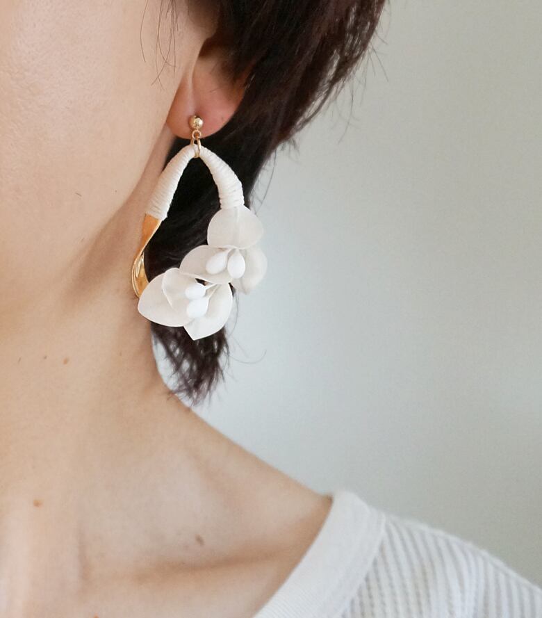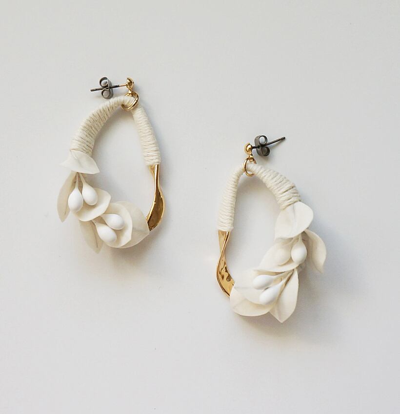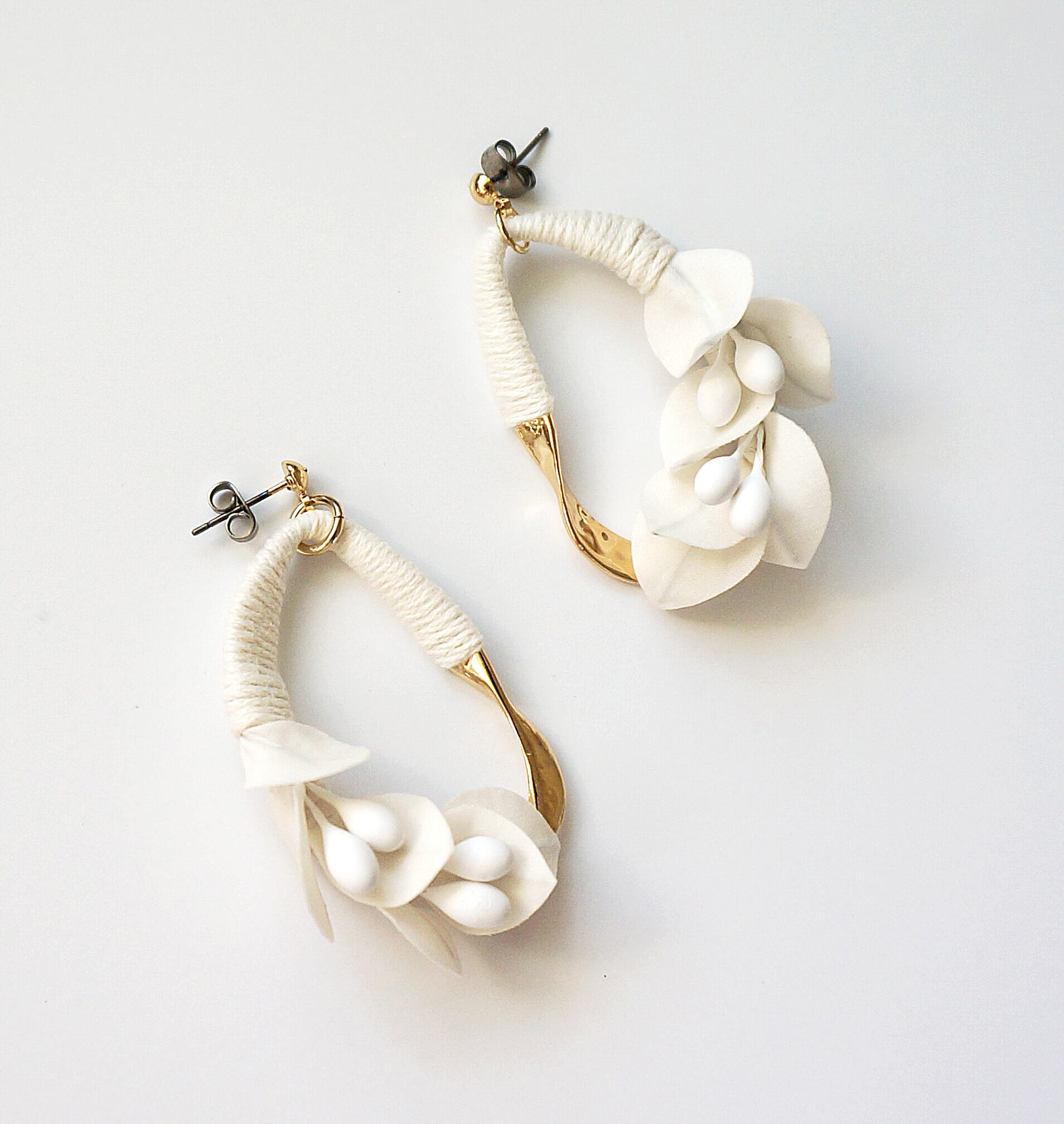 ナチュラルなシルエットのリーフモチーフ、コットン糸を組み合わせたピアス