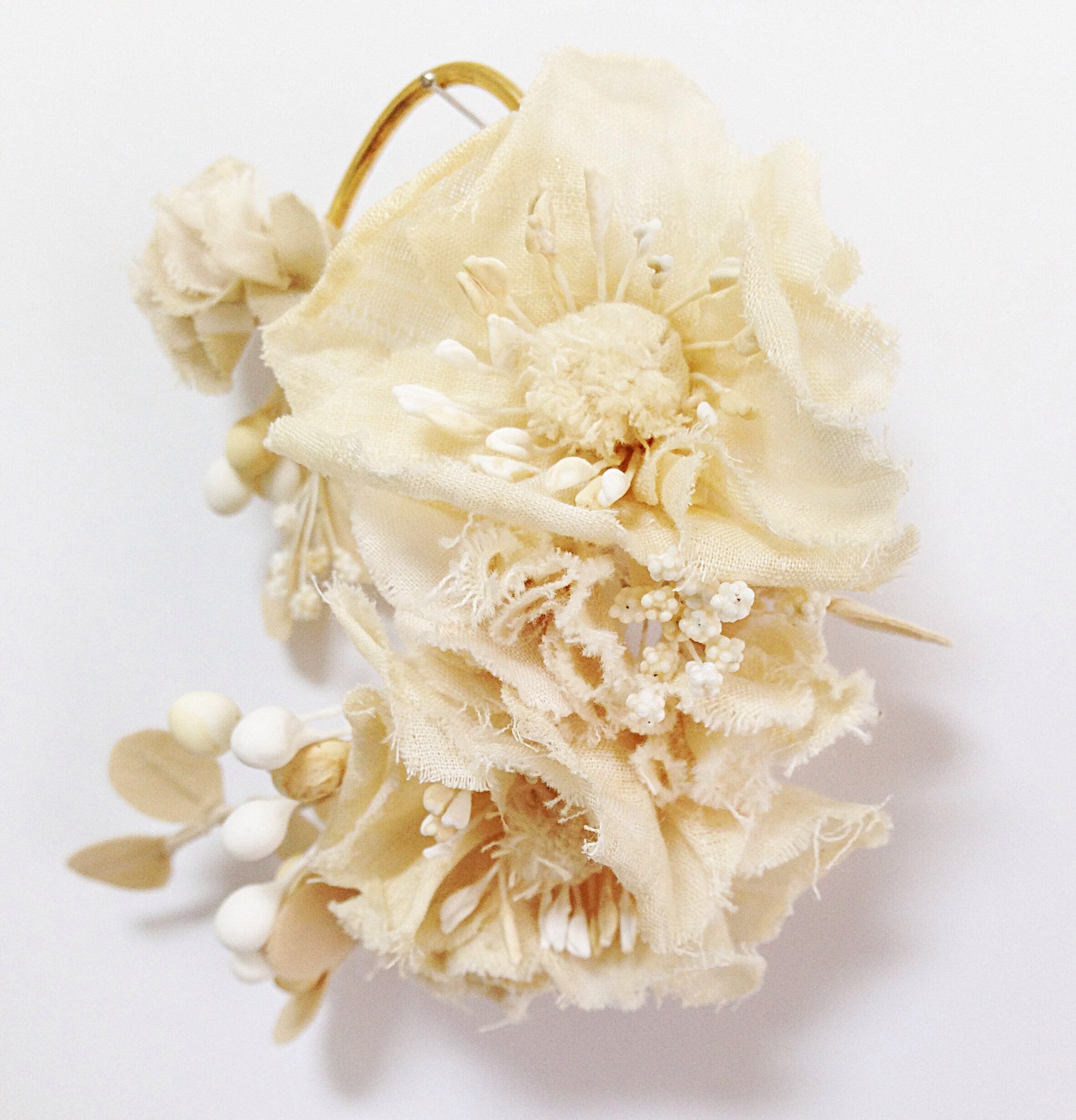 同じ紅茶染めを施しても、それぞれの異なった風合いが出ていて、それぞれの花がナチュラルな雰囲気を出しています。