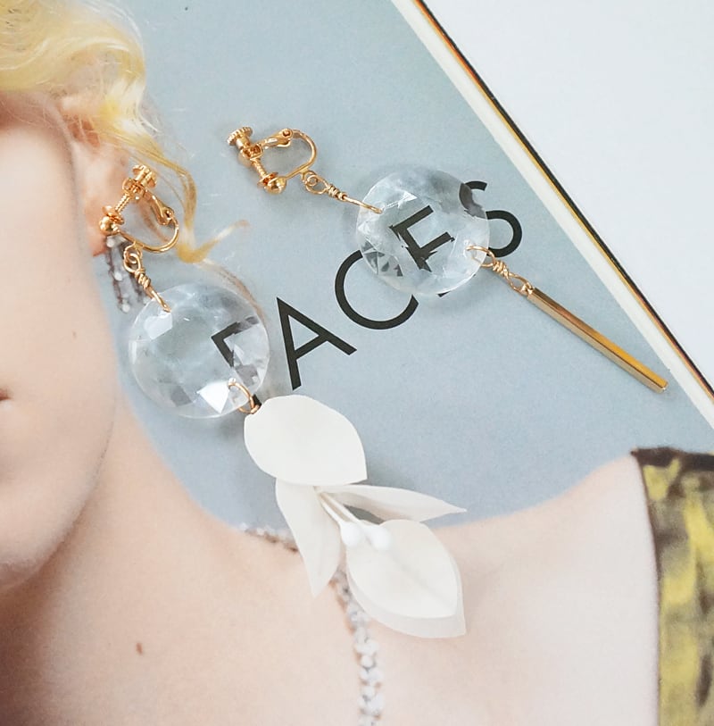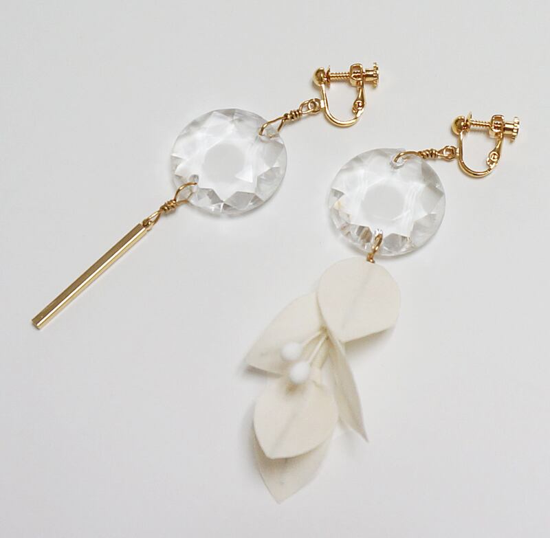 デザインが片方ずつ違っているので、お手持ちのイヤリングと組み合わせて着けても楽しめます。