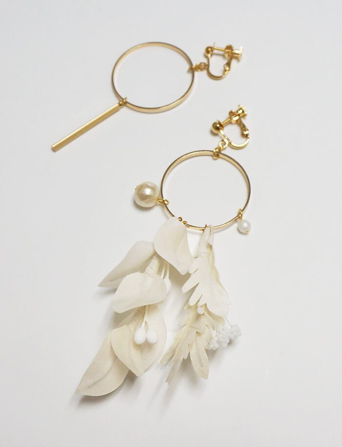 紅茶で染めたコットン生地で作ったリーフモチーフと、メタリックなフープを組み合わせたアシンメトリーなイヤリングです。