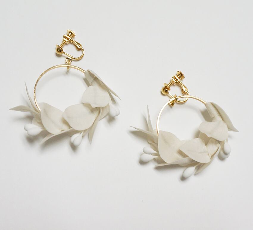 リーフモチーフとメタリックフープを組み合わせたイヤリングです。