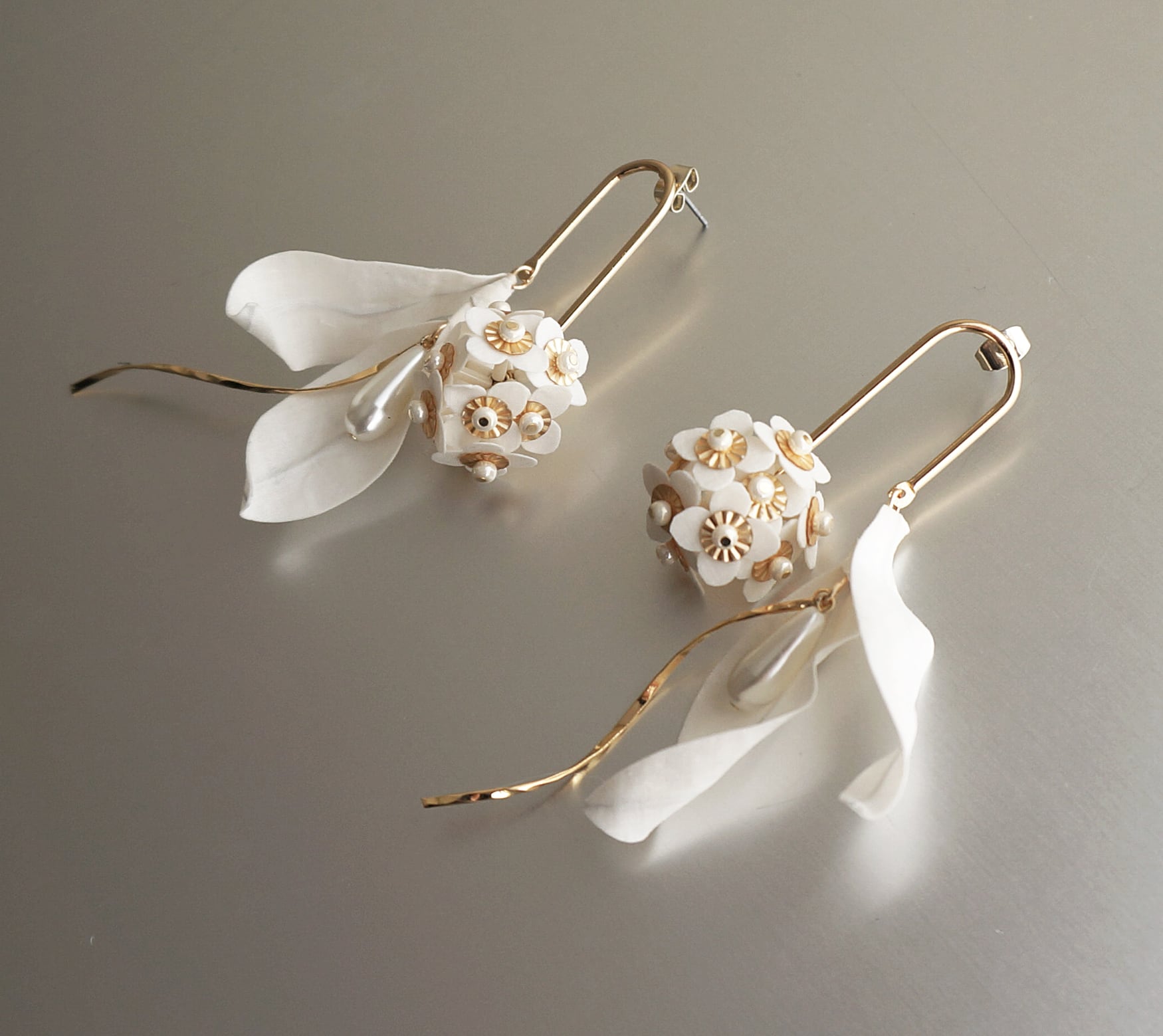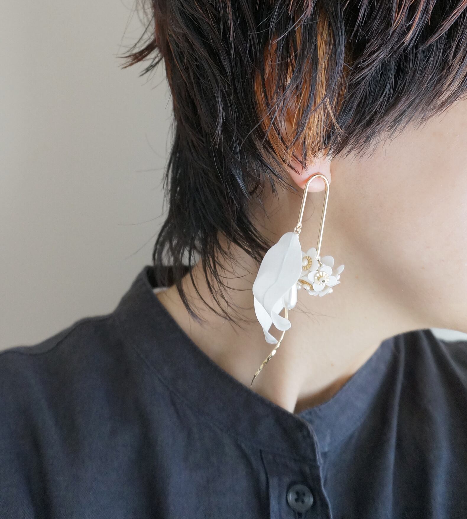 ゴールドカラーの蔓も揺れてボタニカルな雰囲気いっぱいのデザインピアス。