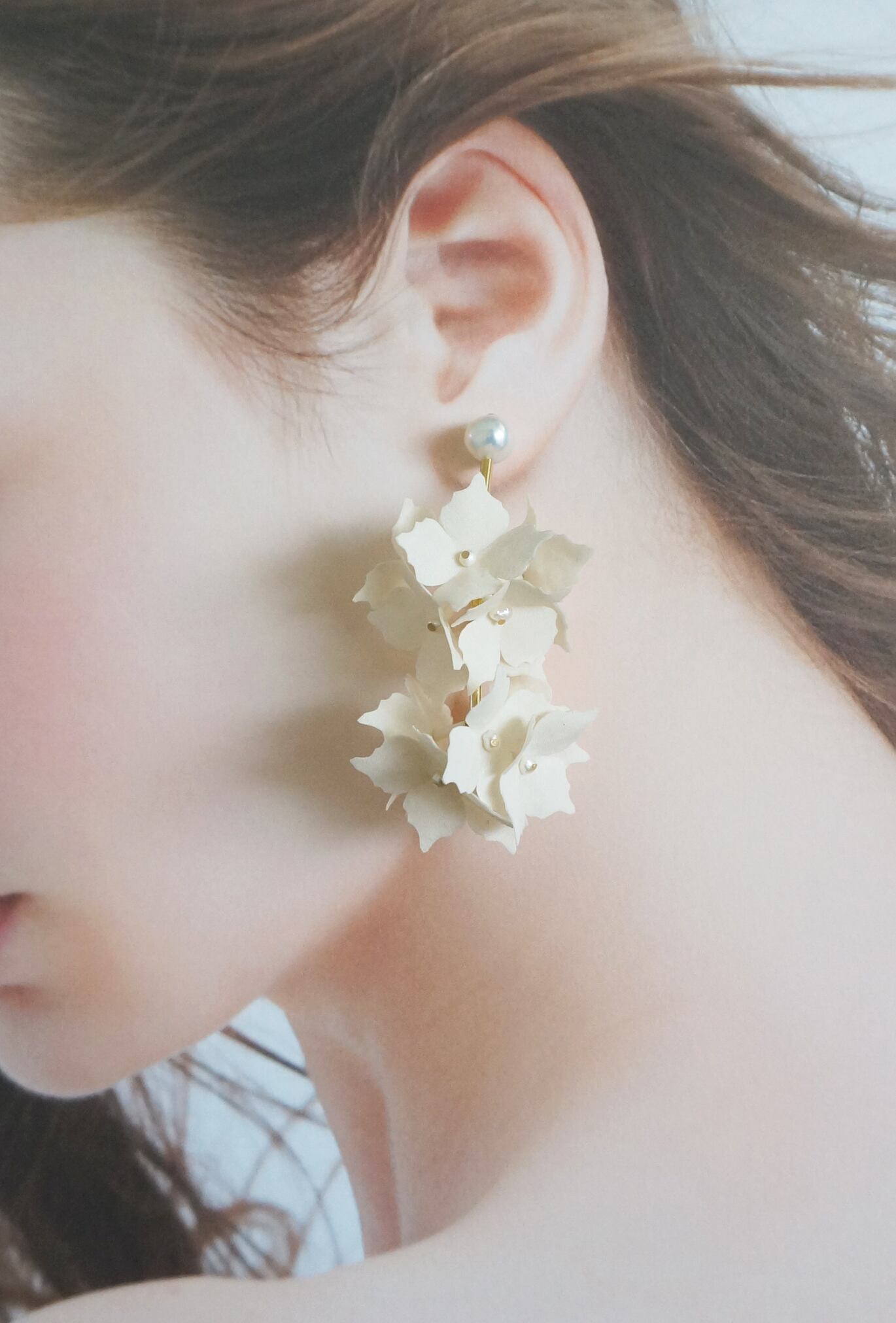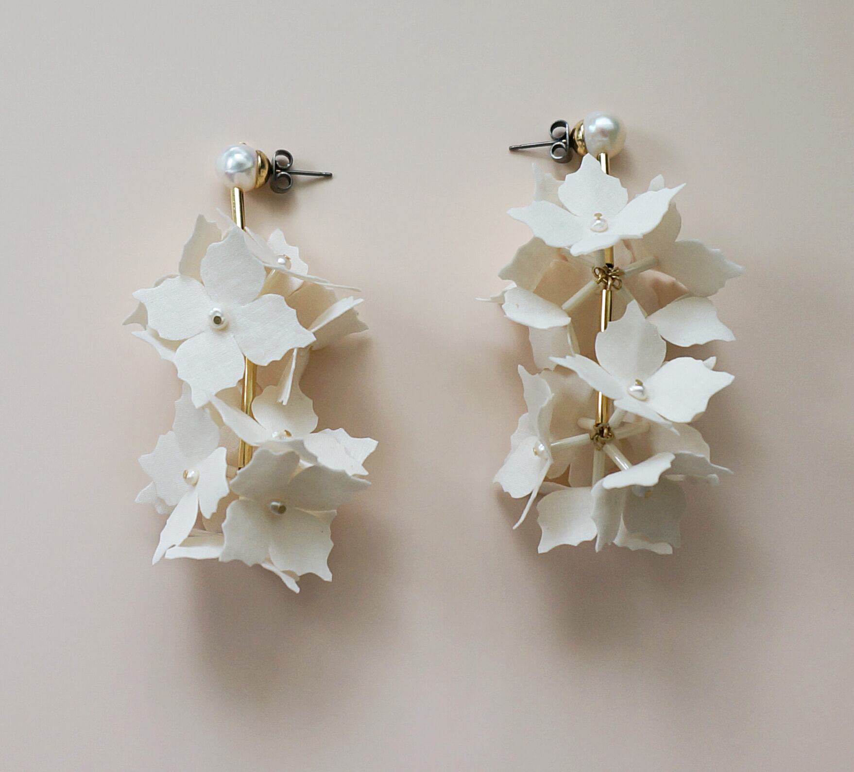 フラワーモチーフを立体的にたっぷりあしらったロングピアス。