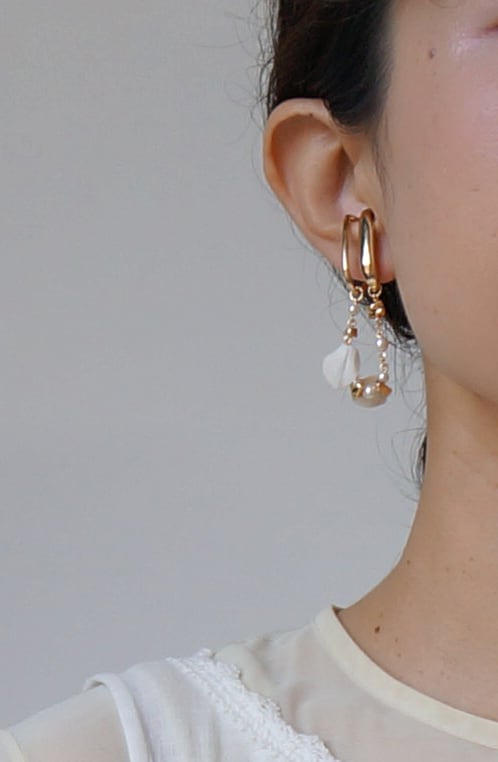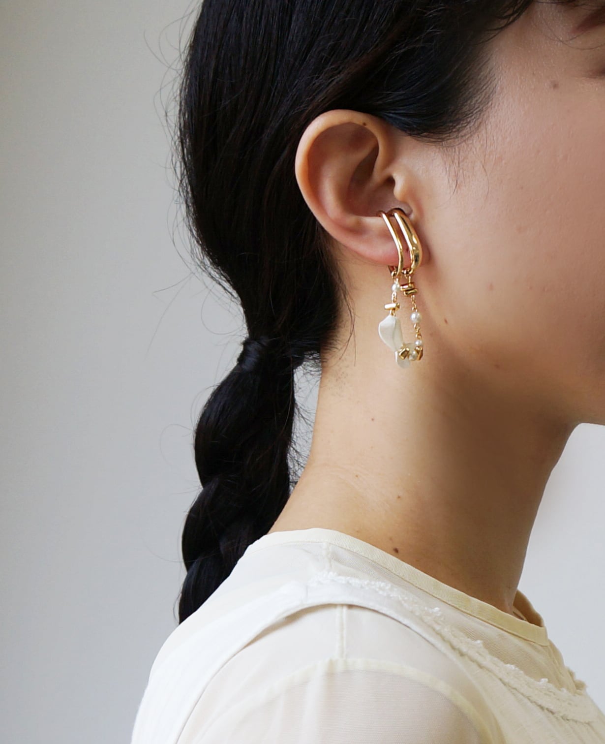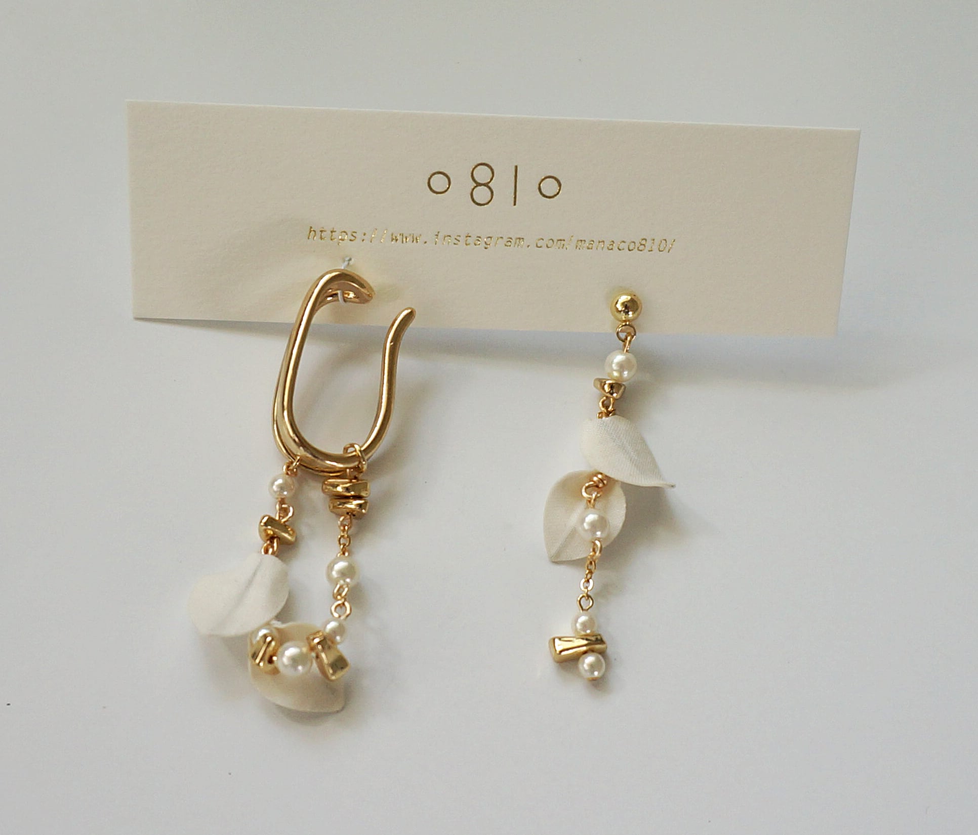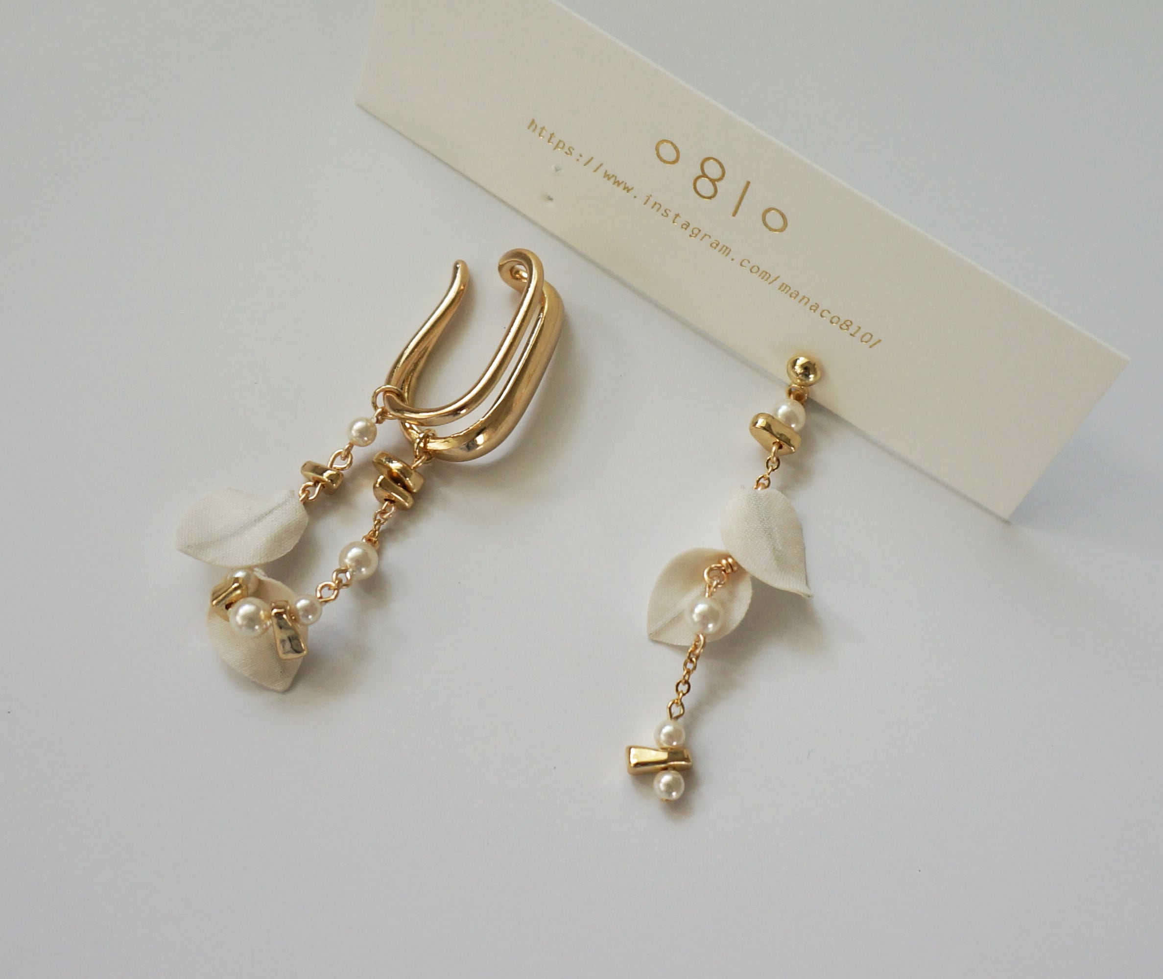 不揃いなメタリックビーズとパール、リーフモチーフを繋いだイヤカフとピアスのセット
