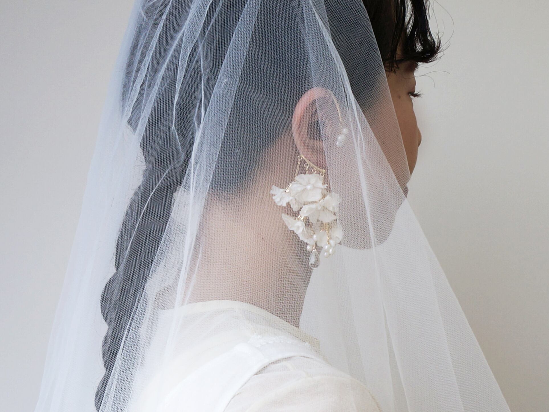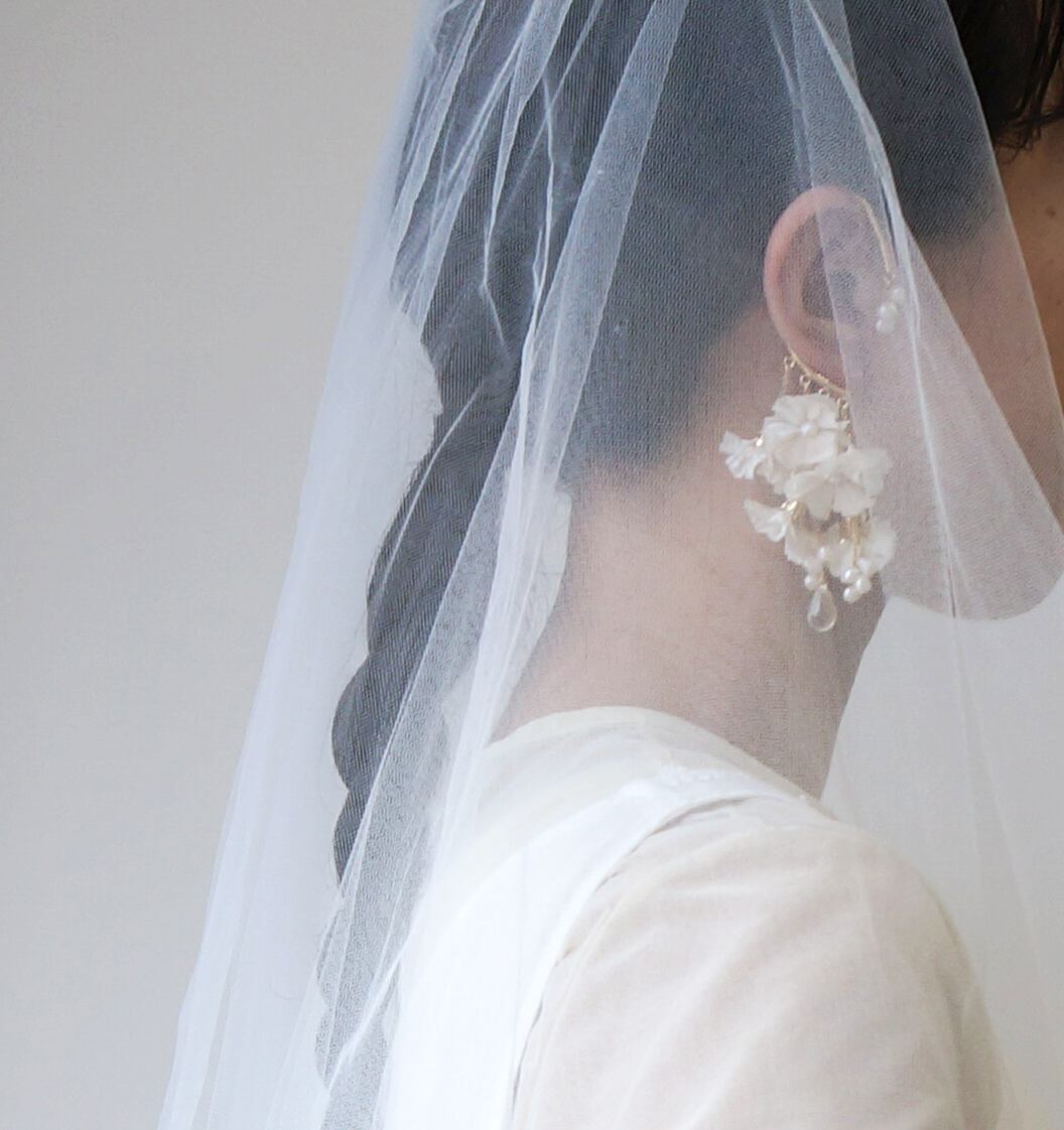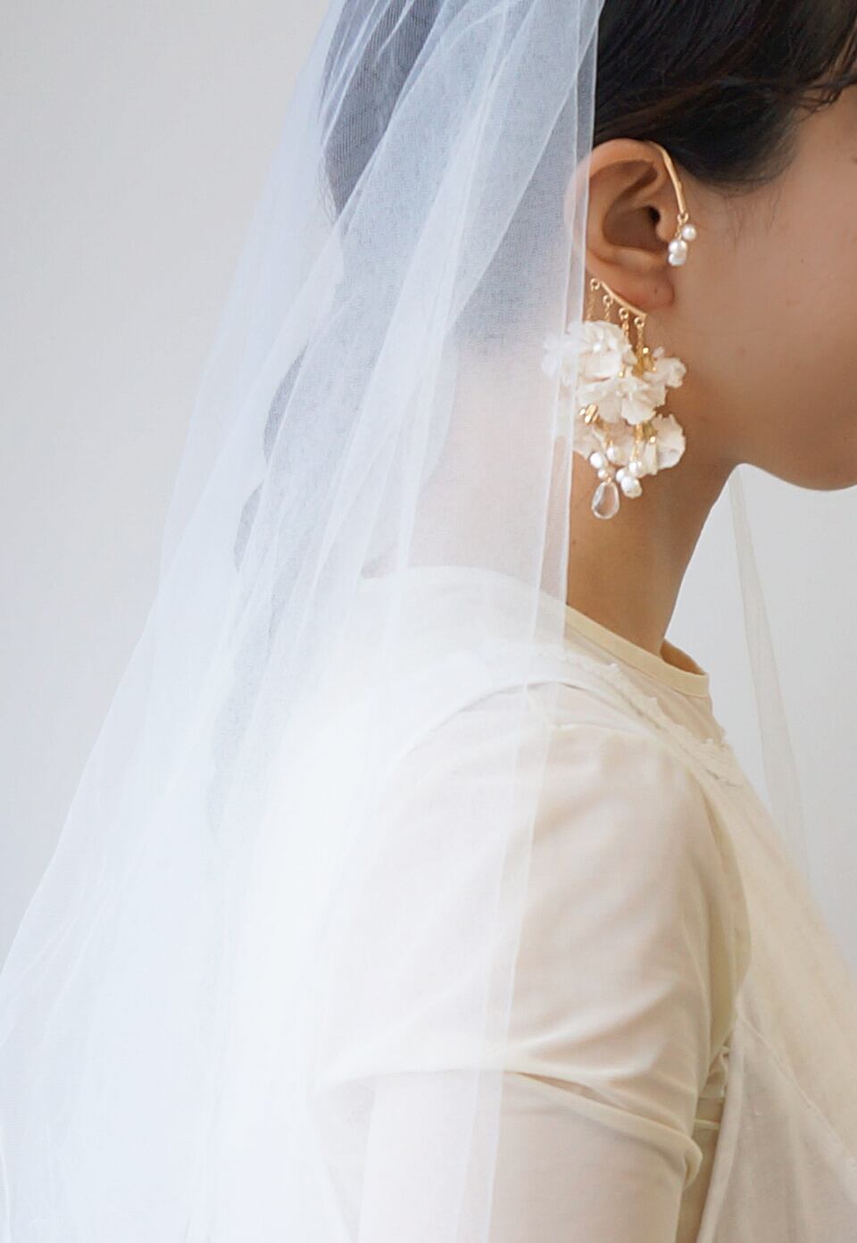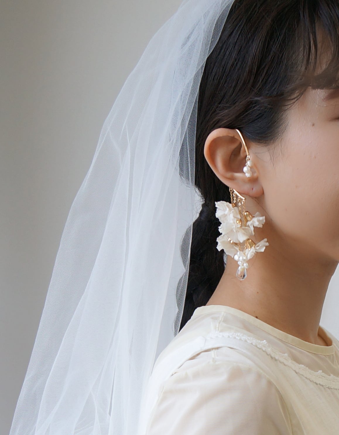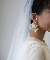 小粒の淡水パールとクリアなしずくパーツをアクセントに加え、